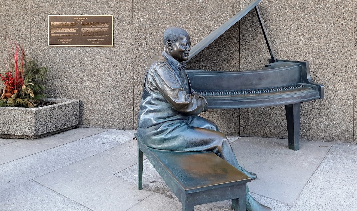 This life-size sculpture of Oscar Peterson is located outside the National Arts Centre in Ottawa ON. His piano recordings are played 24/7, and can only be heard within say...4 metres of the sculpture. It attracts passersby as does the invitation to sit beside the figure on the bench. I passed it daily for a year and often saw people sitting beside him for a moment. Like the comment about public art in Chicago, the sculpture garden there is full of art to interact with.